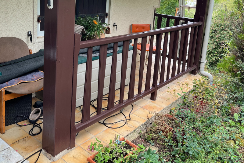 Mise en peinture complète des rambardes et poteaux pour protéger le bois.