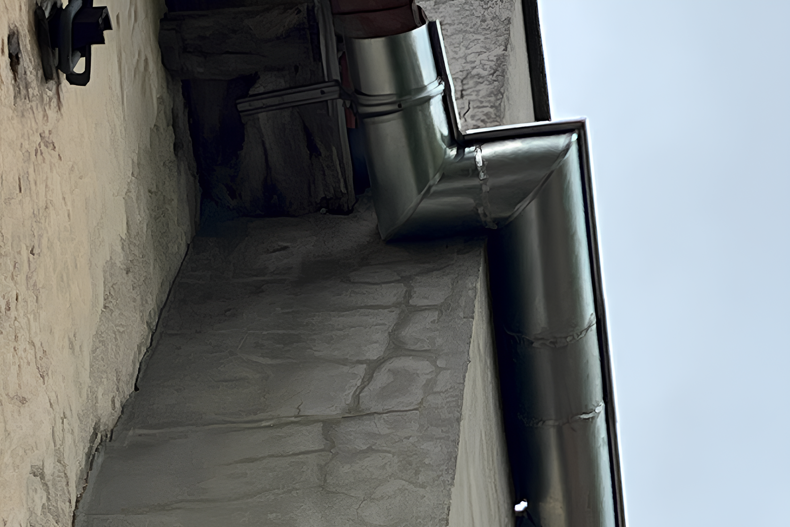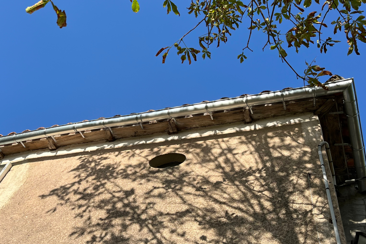 Gouttière repositionnée et sécurisée pour garantir une bonne évacuation des eaux pluviales.