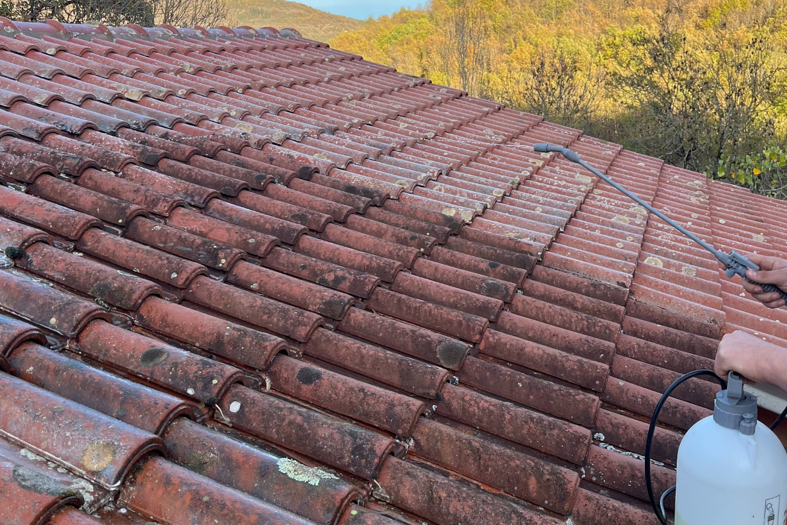 Application d’un traitement antimousse pour assainir et protéger la toiture.