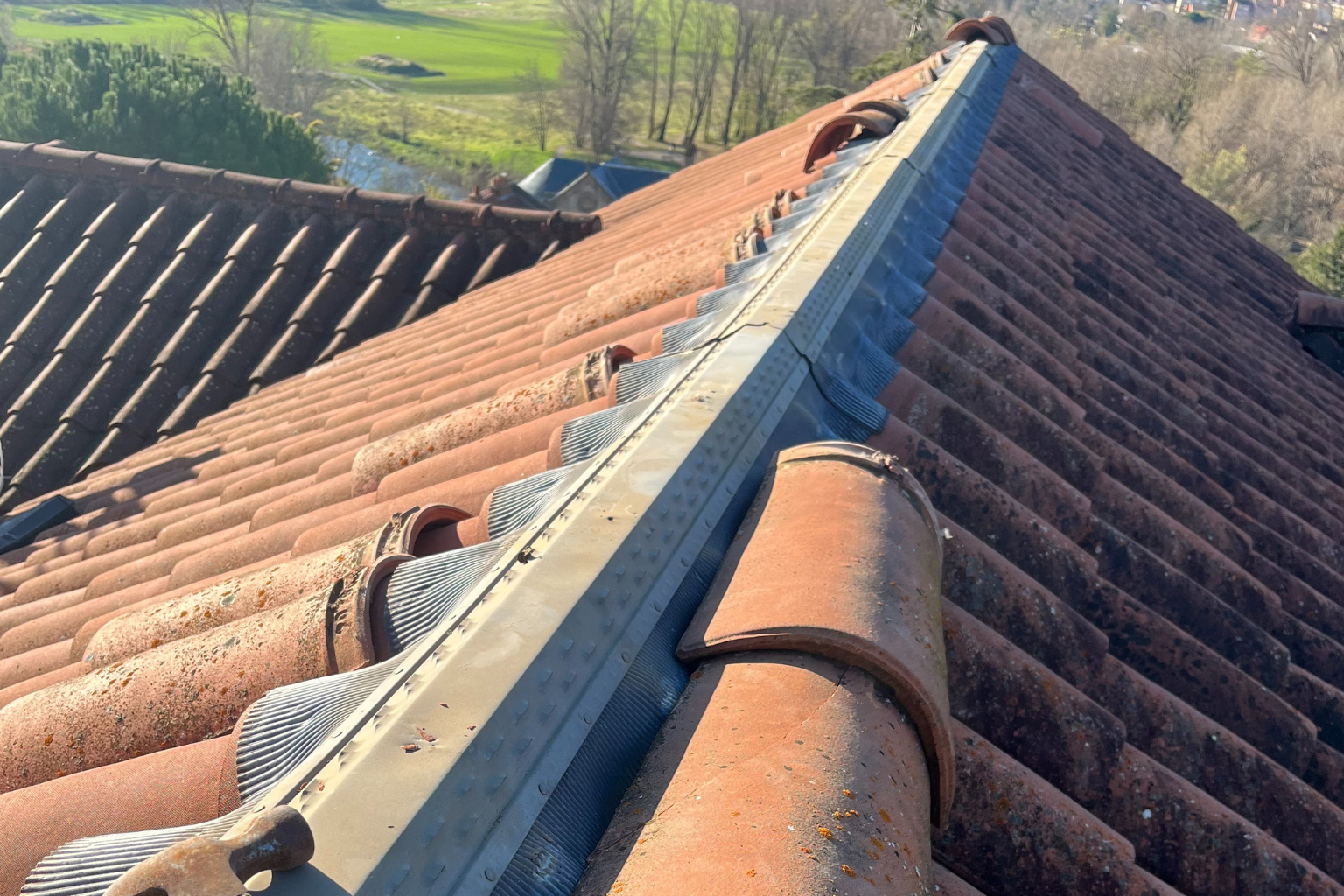 Solins, tuiles fissurées, rives, faîtages, zones d’infiltration localisées.